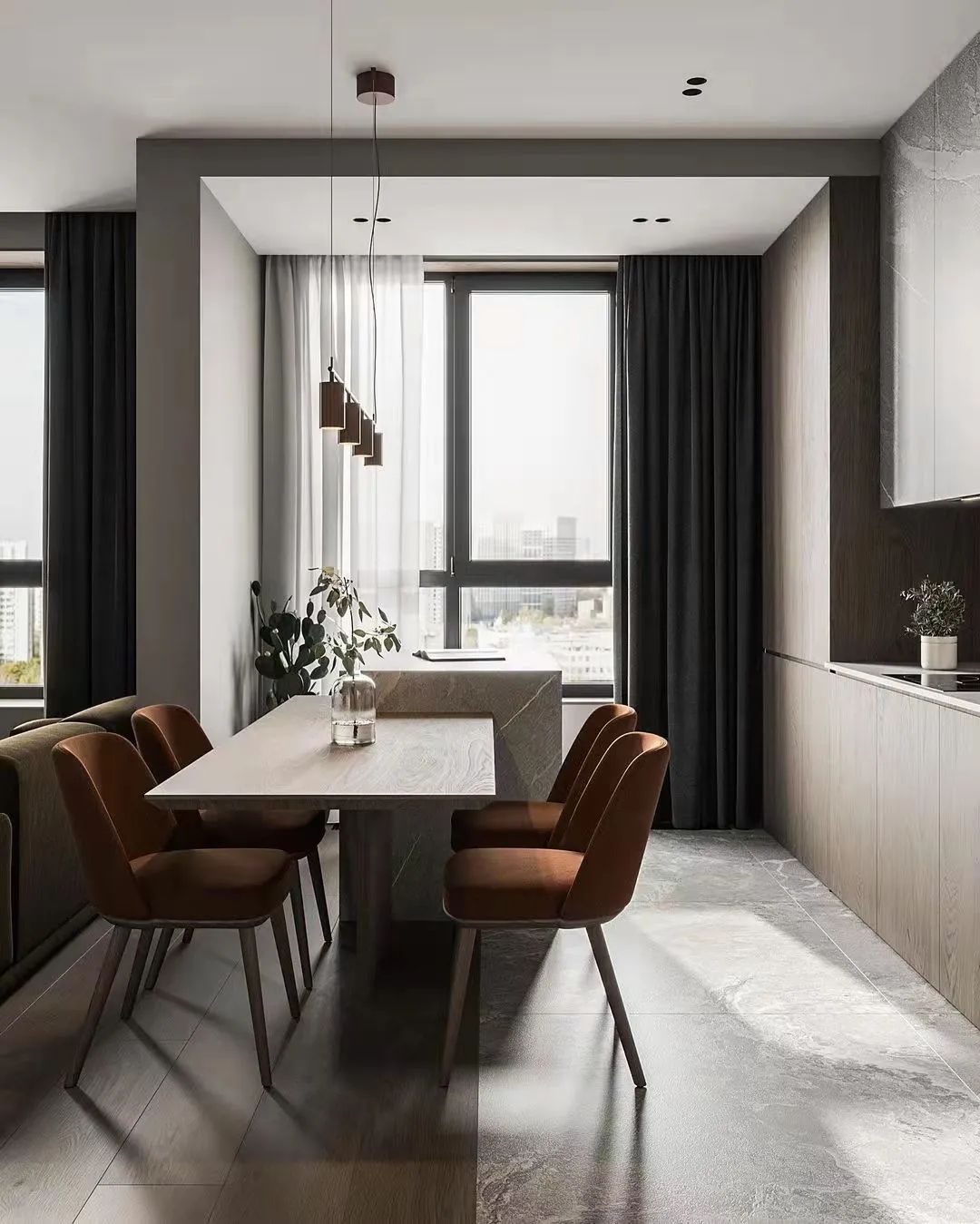 用餐区通过半堵墙和沙发连接而成的视觉分割线而独立,极富美感的选择了大理石工作台面和厨房墙面,既达成了色彩上的统一,也保证了实用性。温暖的橘色座椅搭配桌面上的绿色植物,房间里充满了生机。