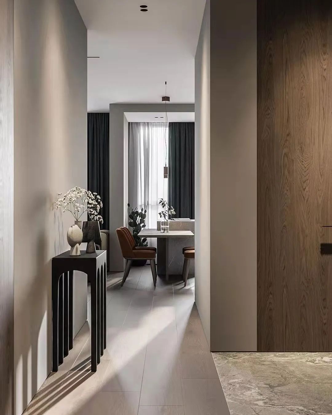 顺着餐厅走过一段走廊即可到达卧室区,设计师通过墙面与小台色彩的对比,让这里的摆设充满艺术气息。