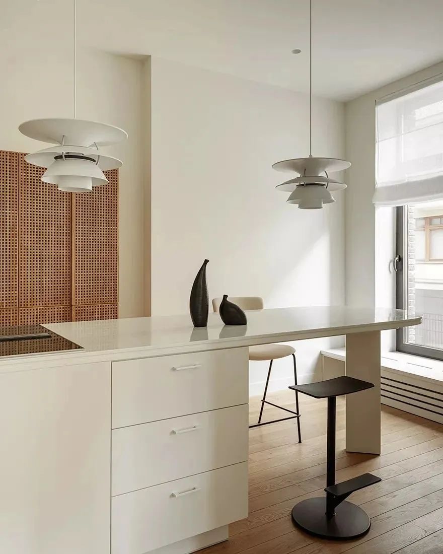 厨房与餐厅位于同一空间,白色的软装家具让空间更显明亮宽阔,中岛台与餐桌相连接,很好地利用了不大的空间。餐桌上方的白色吊灯富有设计感,兼具美观性与实用性。桌面上摆放着黑色的装饰摆件,与整体空间形成了色彩上的对比。