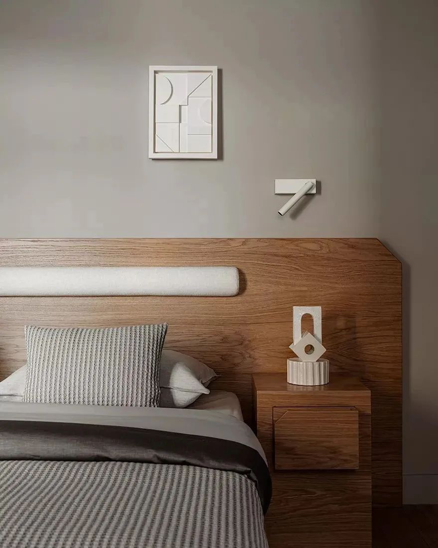 卧室经过精心布置,显得大方简洁又极具现代感。浅灰色与原木色的搭配让空间的整体氛围更显静谧。木质床头柜上摆放着几何组成的摆件,运用物质技术手段和建筑美学原理,创造功能合理、舒适的室内环境。