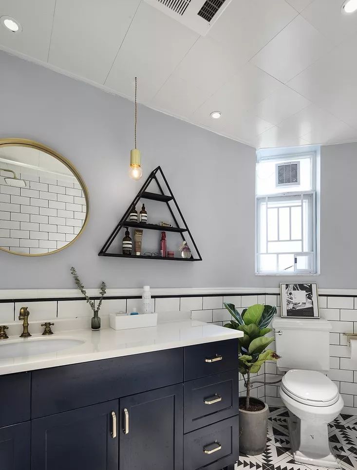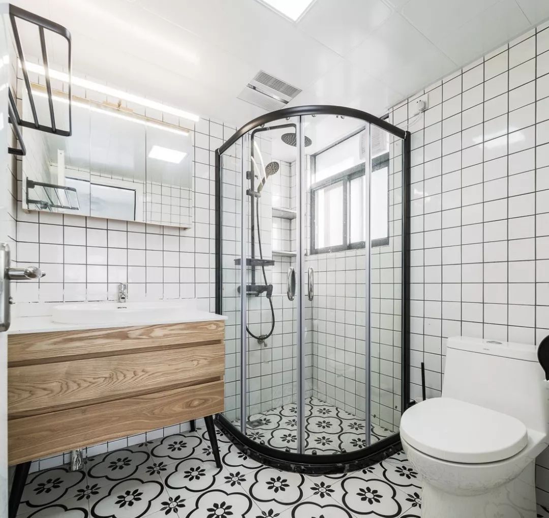 色彩搭配上也不宜过多,小空间颜色多会显乱,浅色墙面深色地面的正常搭配就足够了,想要来点新意,马桶或洗手台区域用花砖点缀,这样的卫生间就足够好看了。