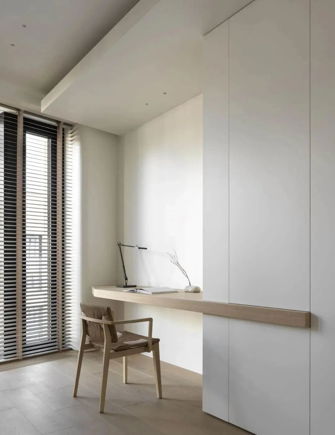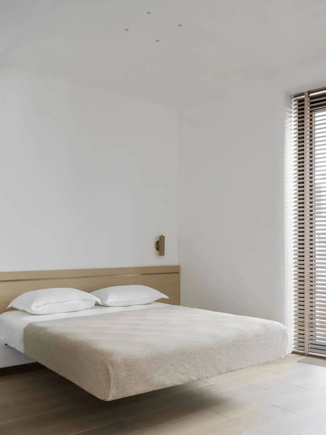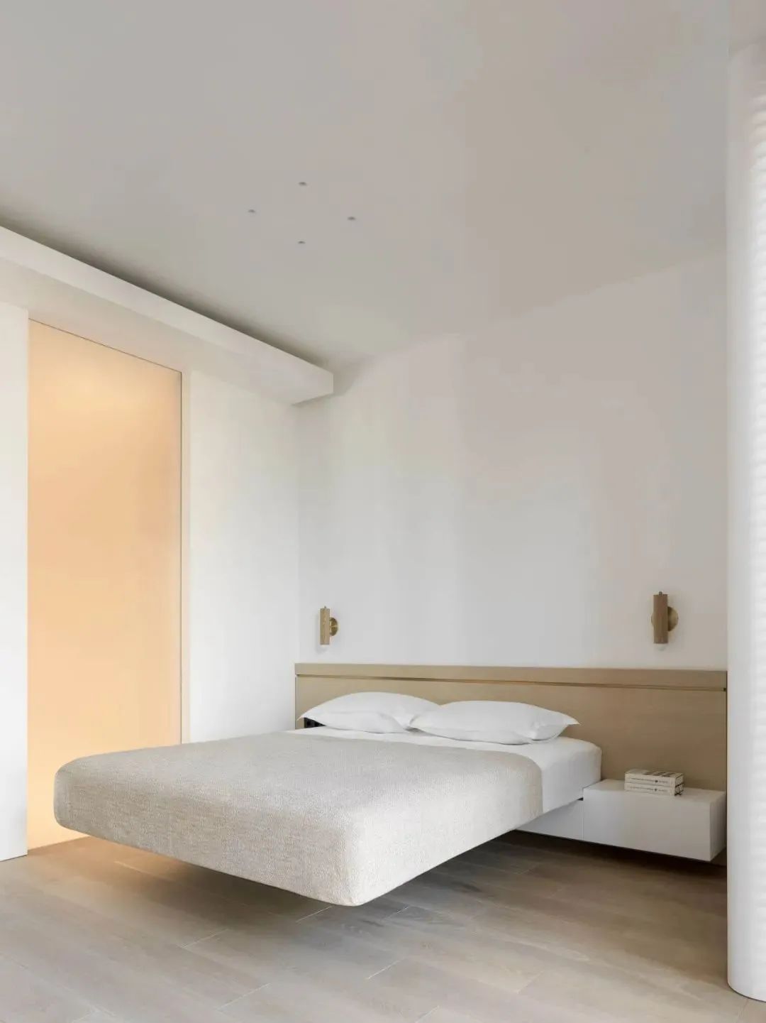 卧室延续了流畅的线条和漂浮的主题,悬空的床体十分吸睛,给人们带来新奇的视觉体验。床头柜与床相连接,更具一体性。一旁的木质书桌与橱柜相连接,为屋主提供了一个能够专心工作的空间。一旁的落地窗,也能让屋主欣赏到窗外的美景,十分轻松惬意。