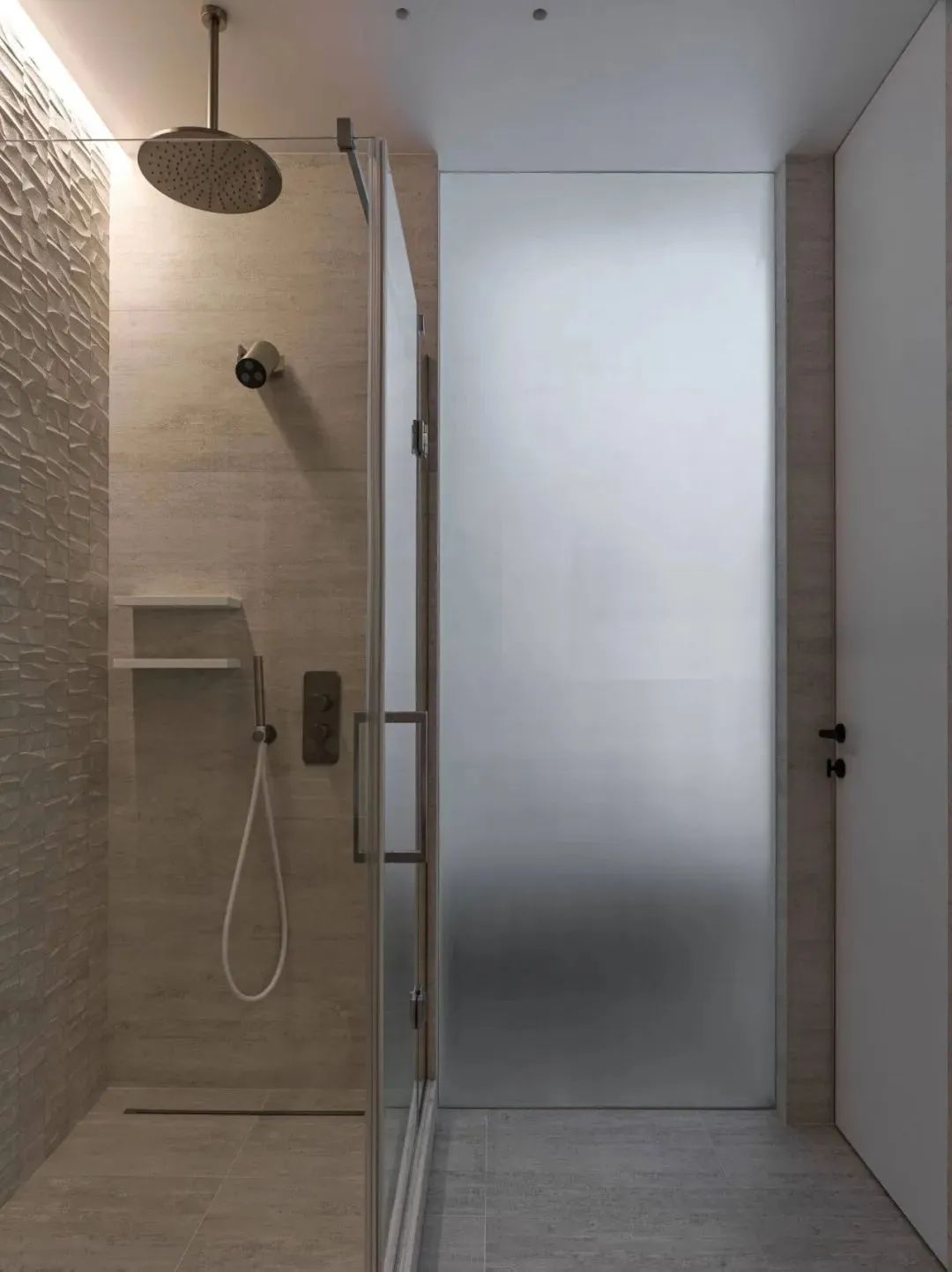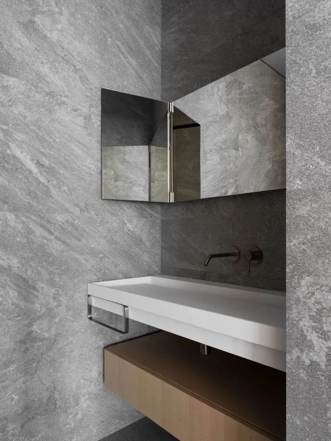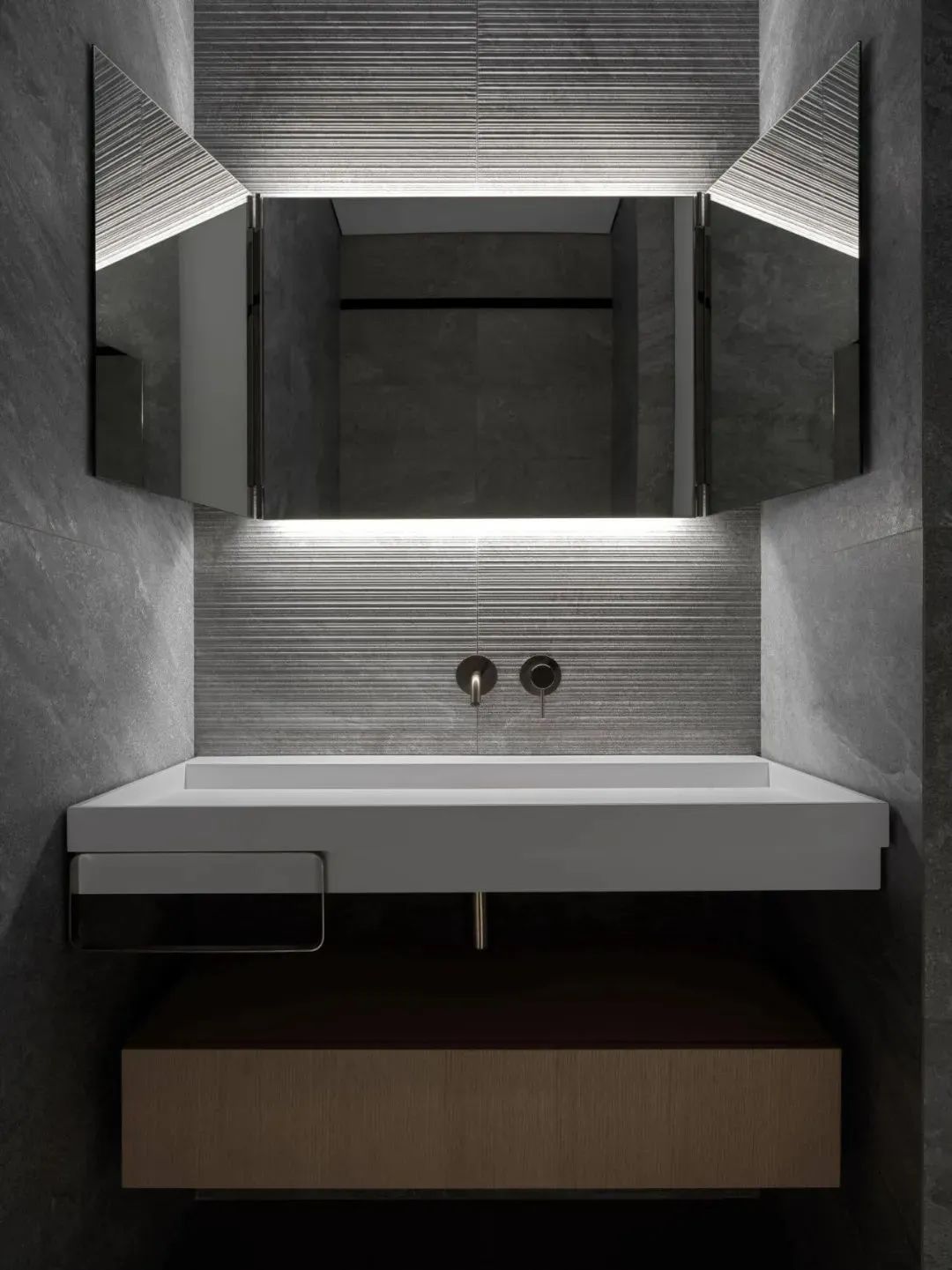 卫生间的内饰设计十分精致,灰色调的空间在灯光的衬托下,显得十分有个性,体现出了主人的生活文化品味。