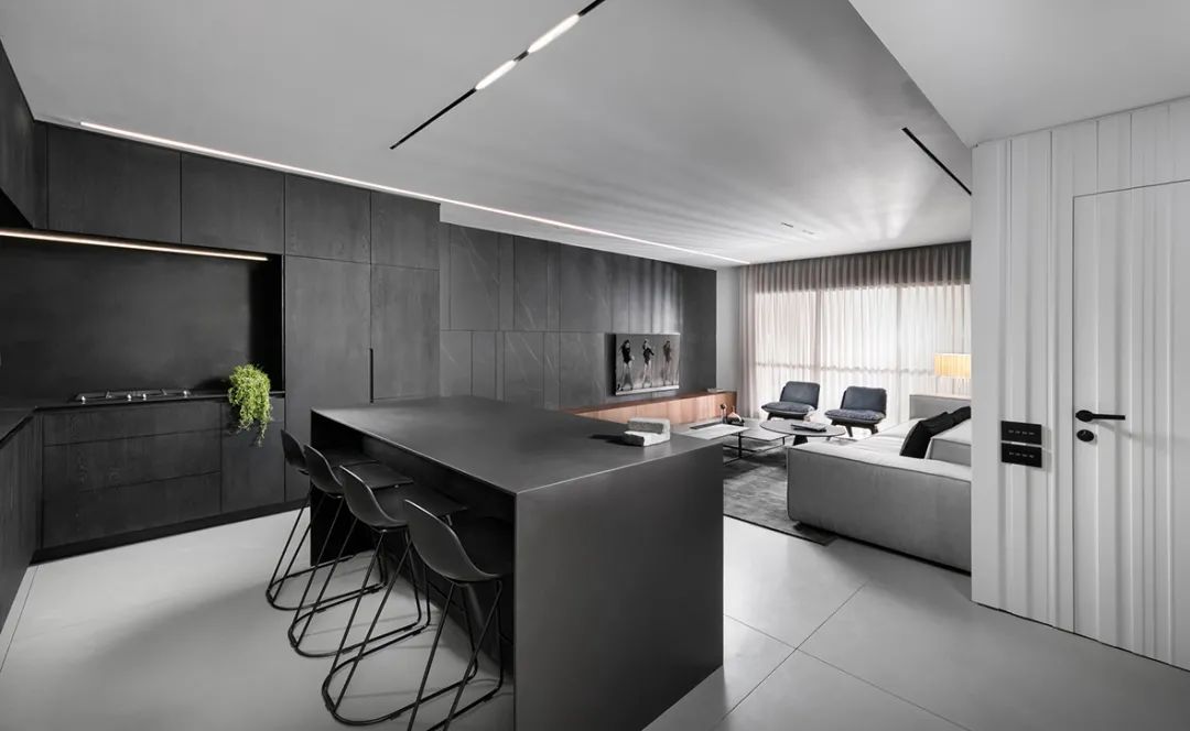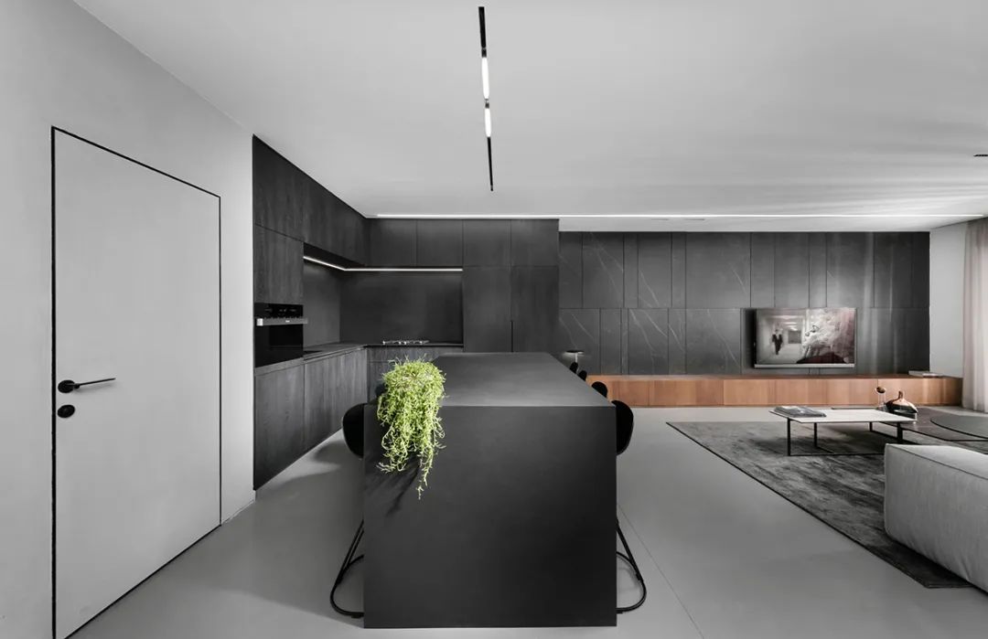 厨房依旧是延续简约的设计,黑与白的色彩拼接,利落的线条搭配上精致的家具,奠定了高度理性的空间基调,哑光黑色的大面积使用沉稳而高级。绿色植物的放置为这片灰白色的空间增添了一抹色彩,展现了极简主义下的生活美学。