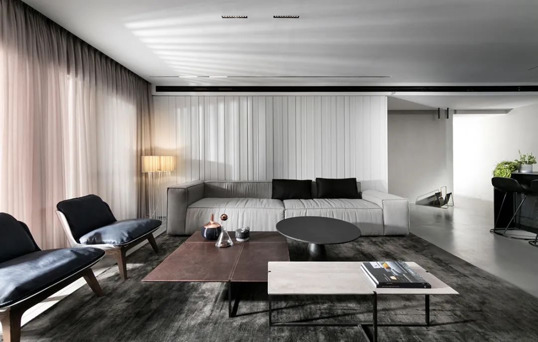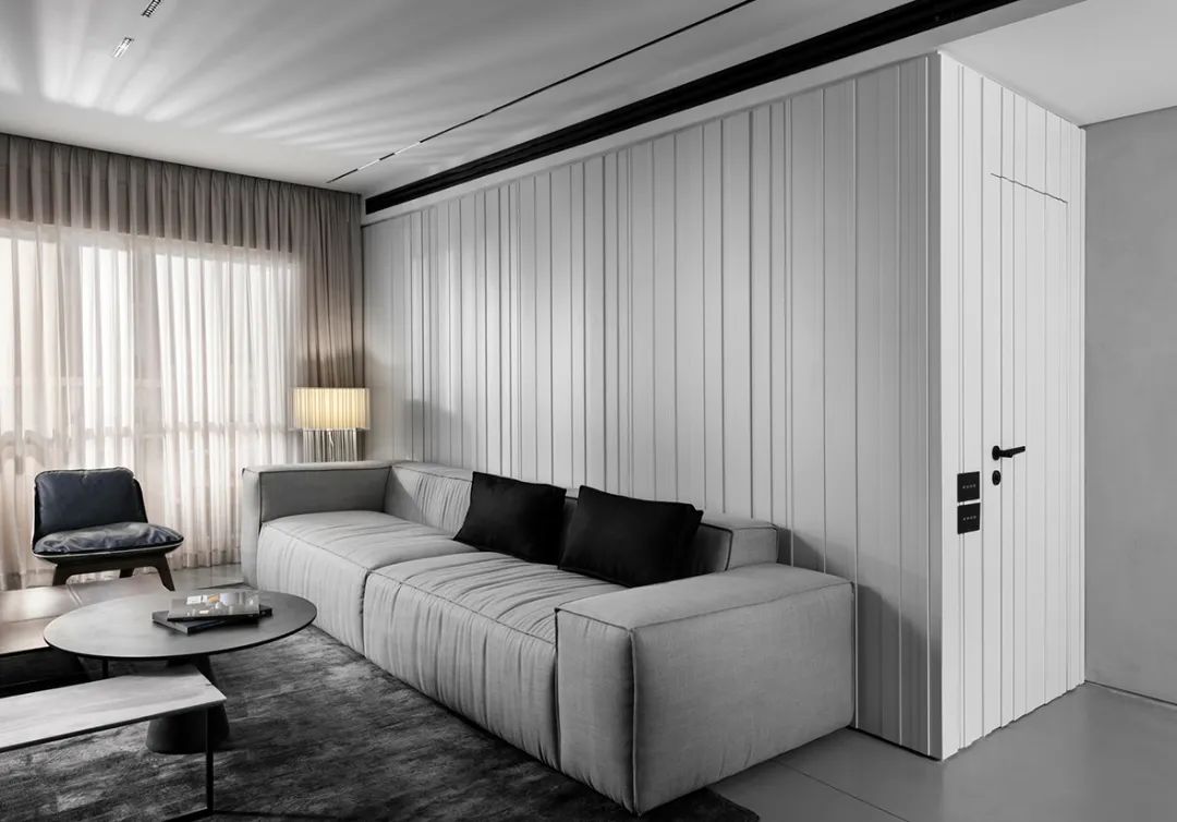 公寓的整体依旧是采用高级灰配色,低饱和度的色彩搭配营造了一种高压绚烂的空间气质,简单的配色贯穿于空间中,使得空间的整体性更强。