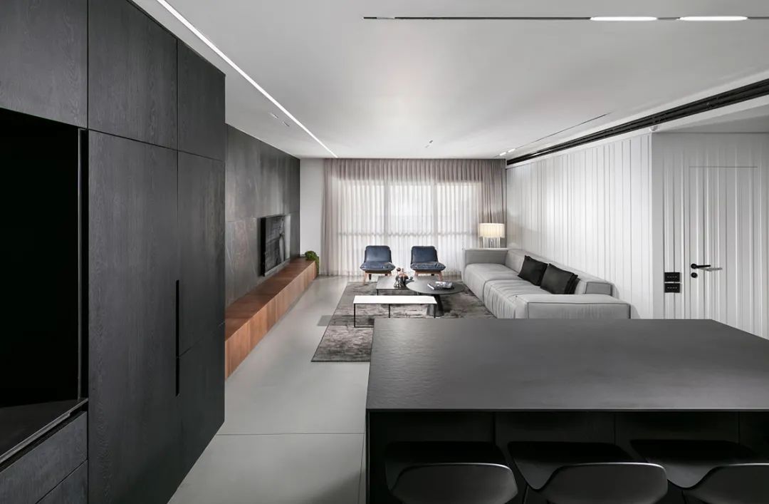 客厅与厨房位于同一空间,开放式的设计让公共空间的面积更大??吞写竺娴穆涞卮拔夷诖戳顺渥愕墓庹眨苍黾恿丝占涞耐ㄍ感?。哑光黑色的电视墙,提升了空间整体的质感。