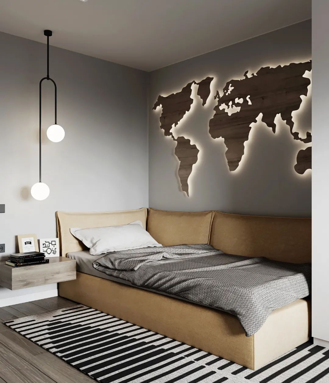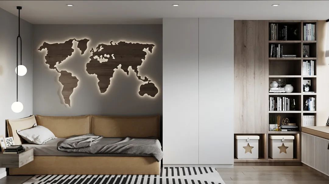 儿童房遵循业主的要求,选用灵活式的教学方式,将世界地图安放在墙壁上,互动形式的底图更能增加孩子的学习兴趣。