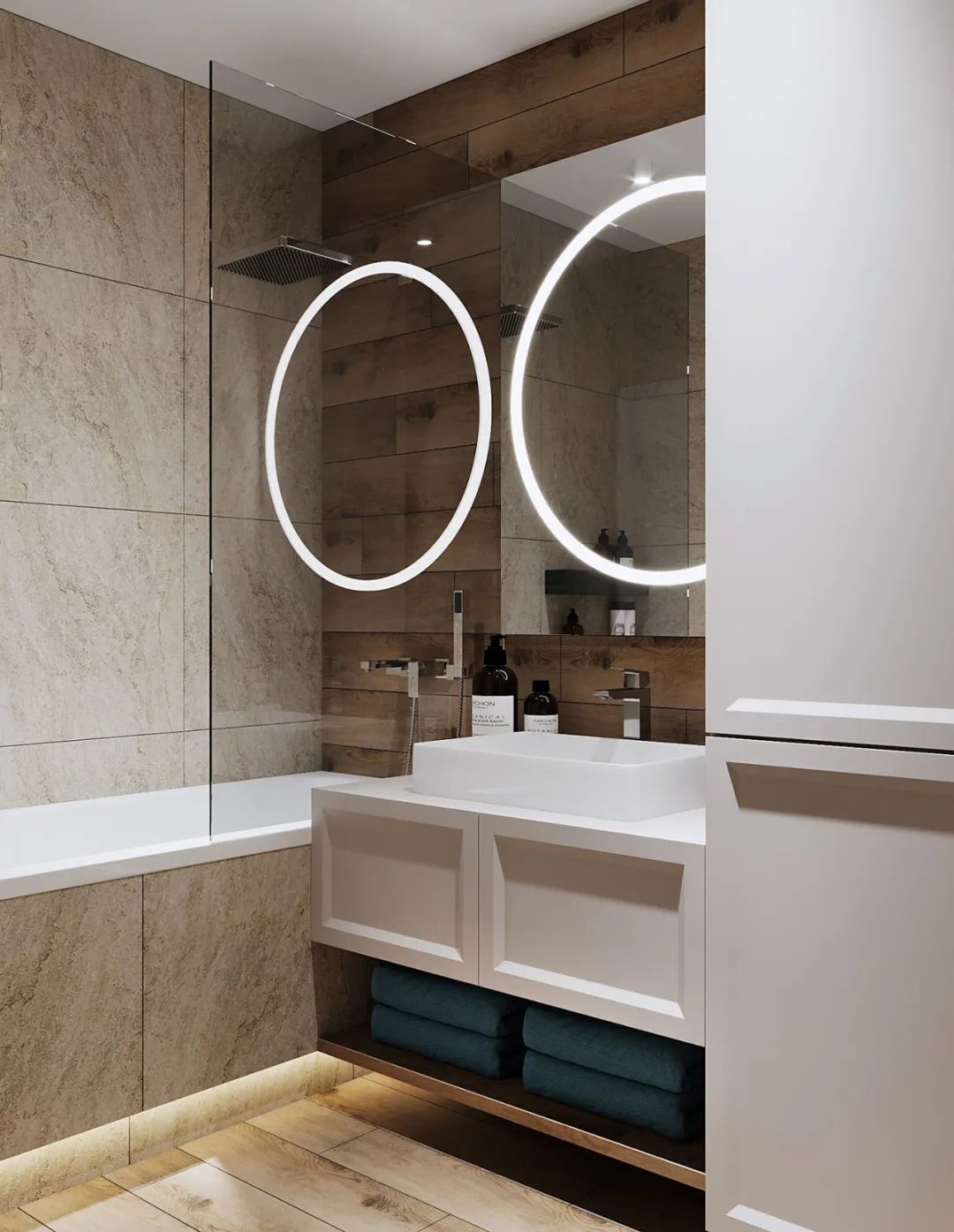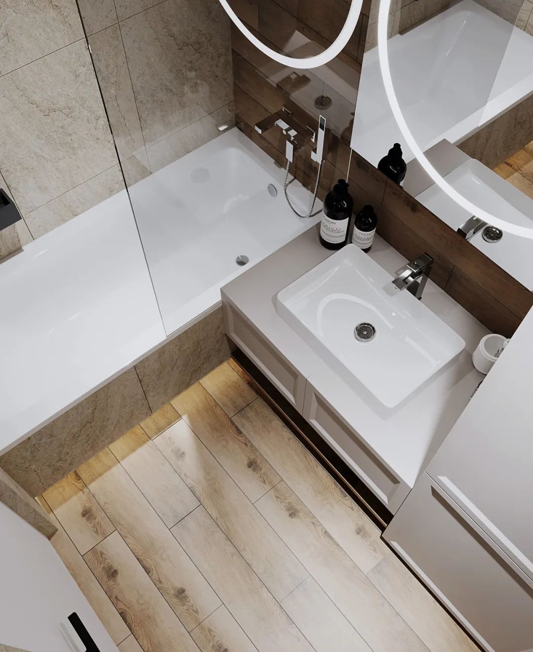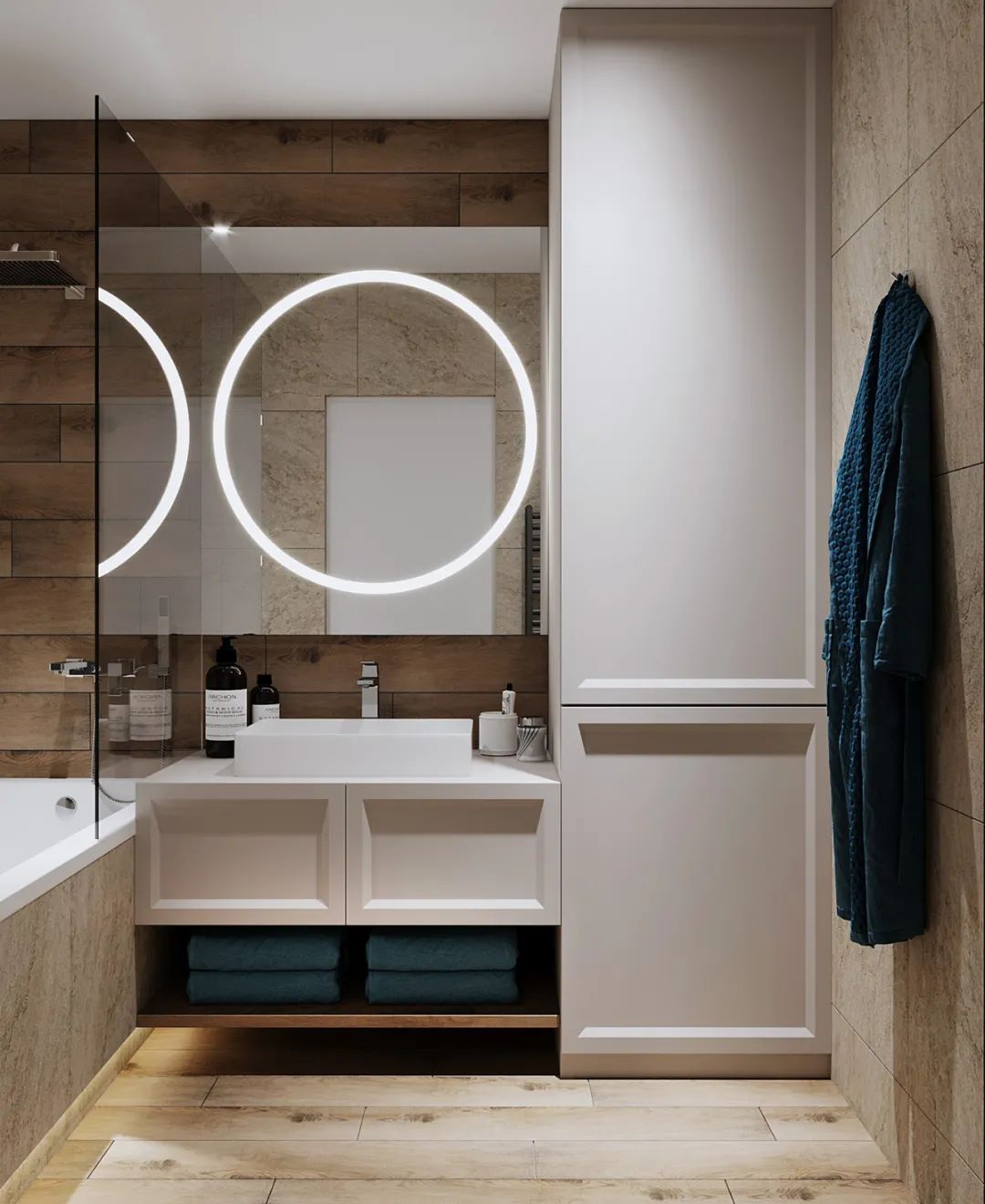 浴室的化妆镜让人眼前一亮,圆形的灯架不仅作为装饰用,更能让女主人在化妆的时候作为良好的打光板。