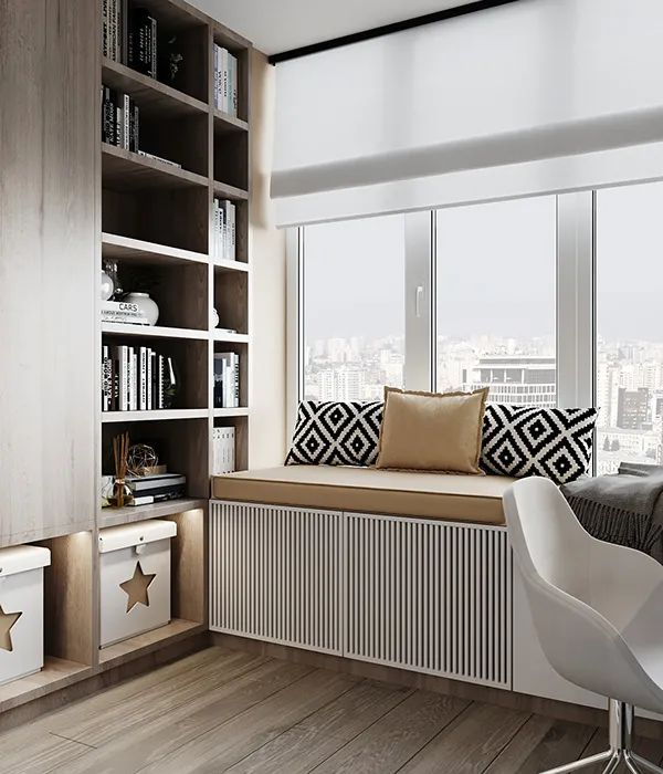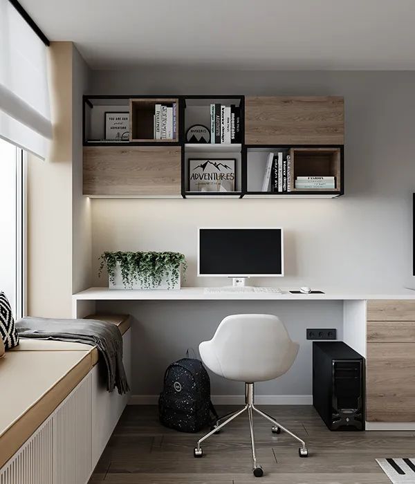 书桌区域非常具有实用感,窗台改造成飘窗区域,更是一个可以休息看书的好地方。