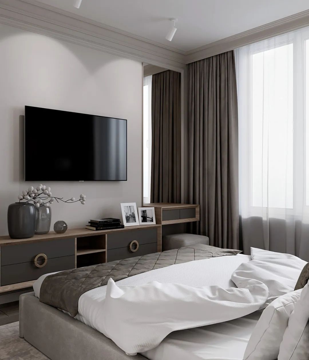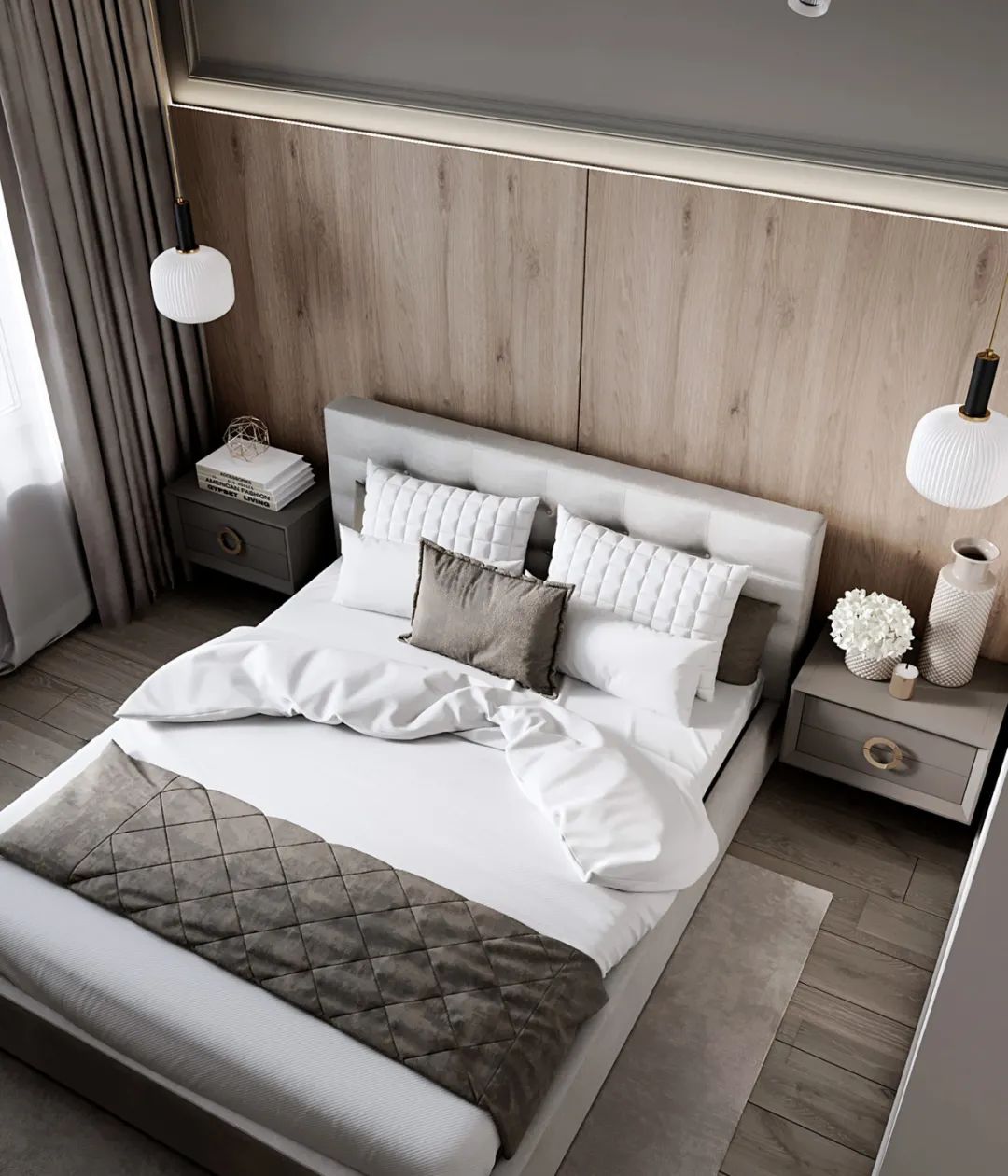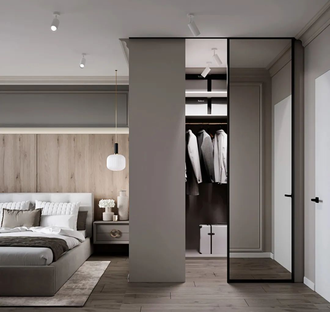 卧室内的软装则选用浅灰色和原木色系,自然光照射进来的同时,也让室内显得明亮惬意。
