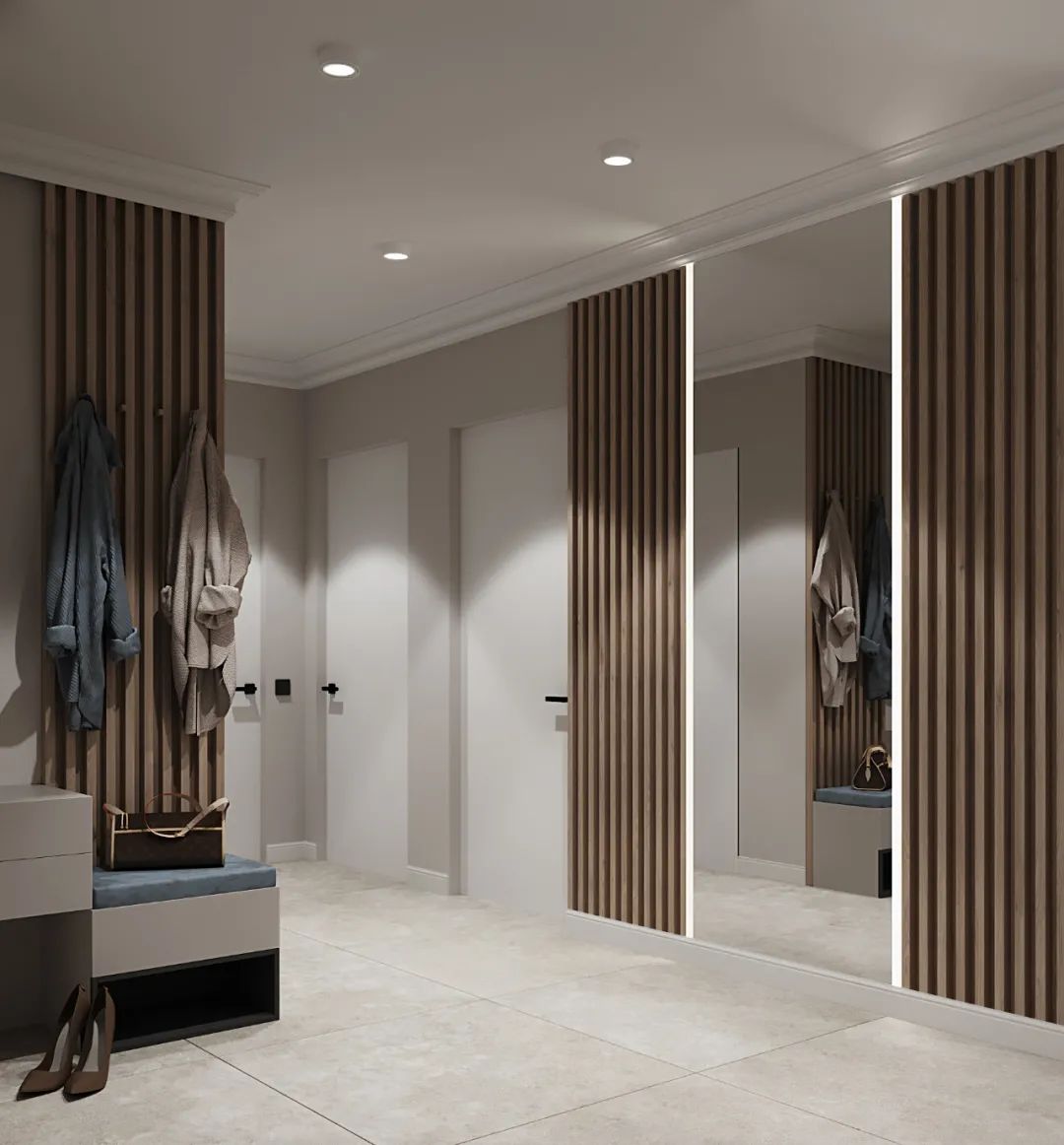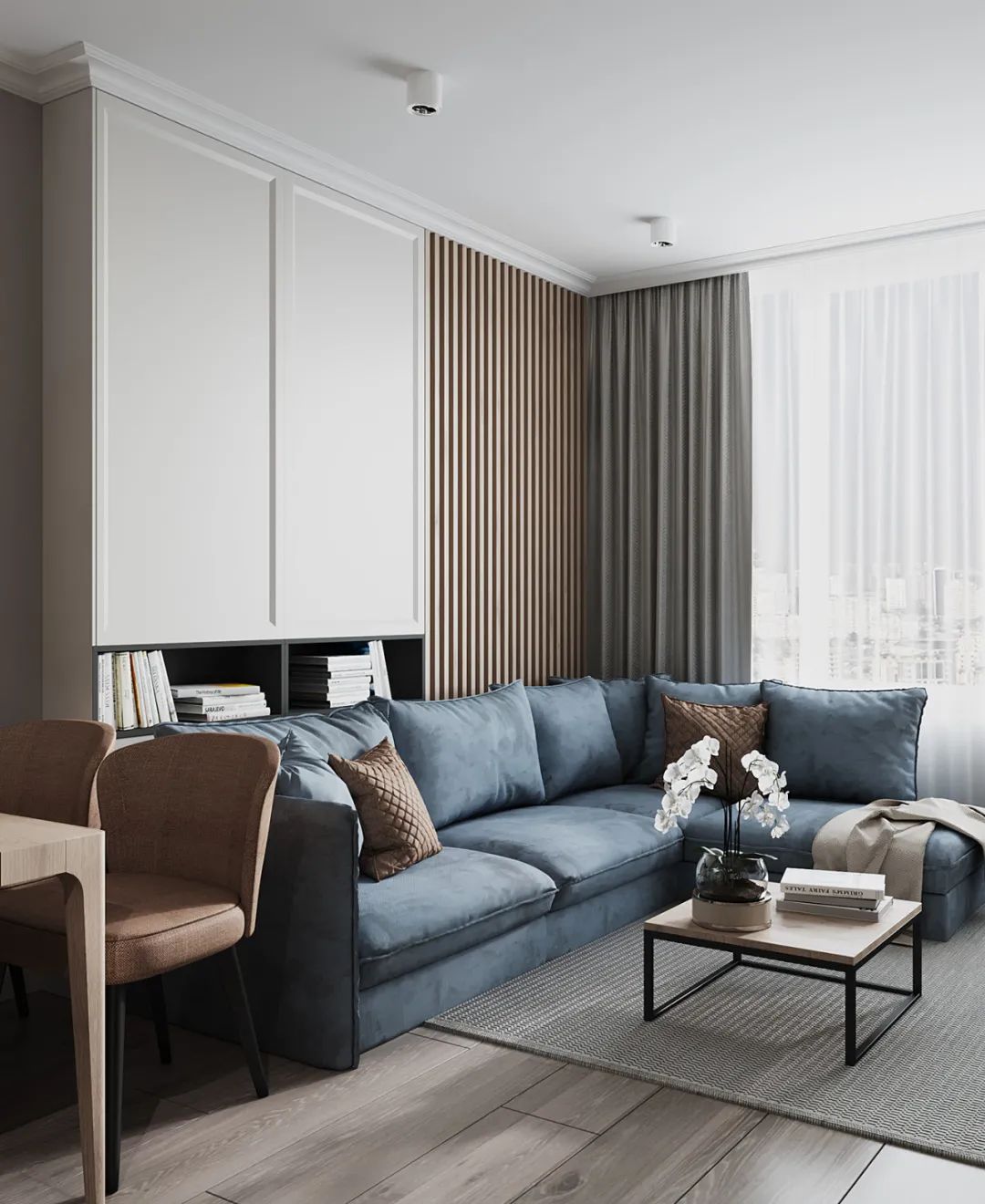 67㎡的两居室里把主卫、客卫、厨房、客厅、卧室、更衣室及儿童房都容纳进去,可谓是将空间的运用发挥到了极致。